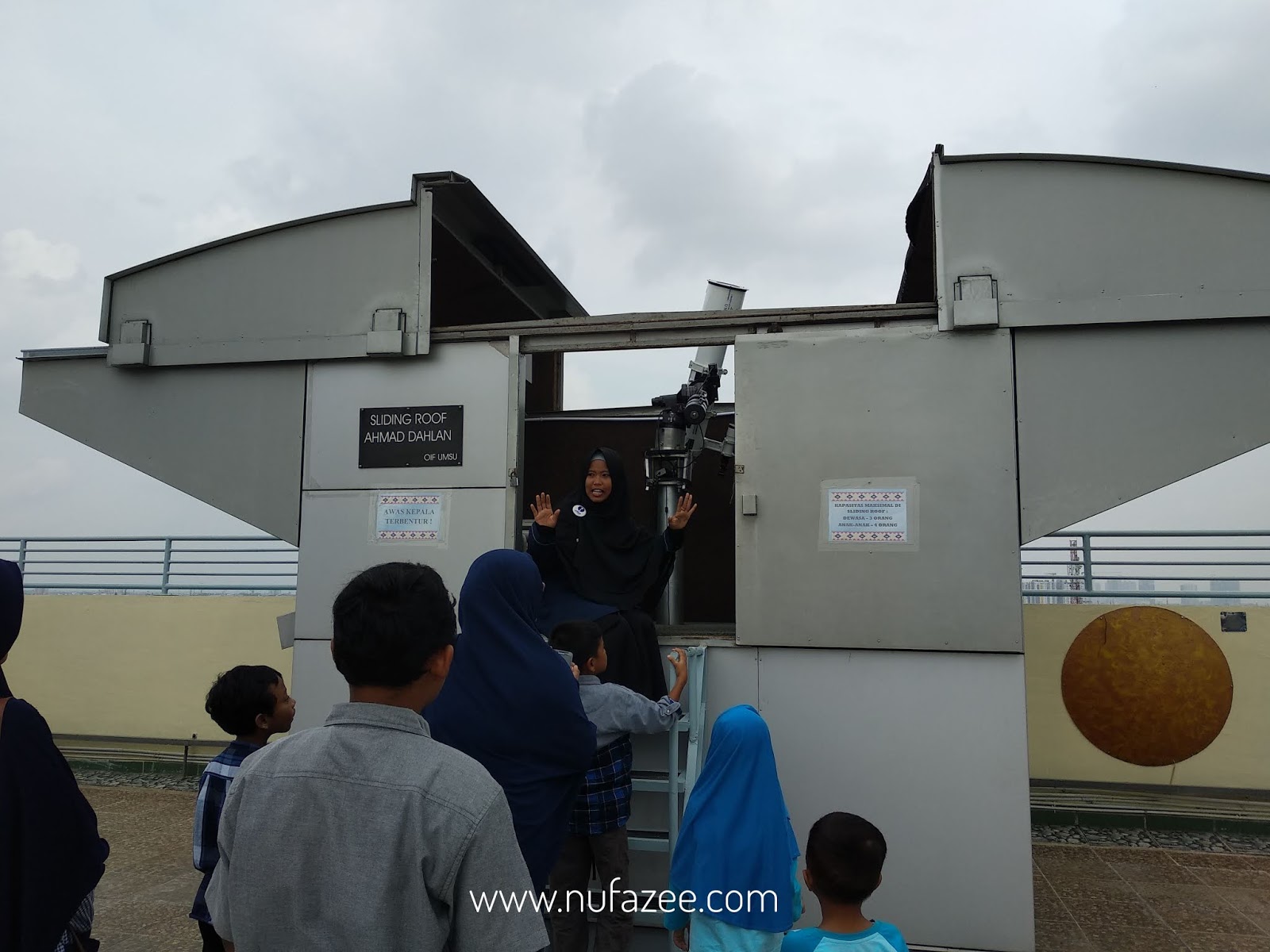Oya, untuk bisa berada di ruangan ini, kita harus menaiki anak tangga yang curam, jadi harus hati-hati. Di dalam ruangan mini itu, selain ada teleskop, ada juga AC dan kipas angin, guna menjaga teleskop agar tetap sejuk dan awet kayak nugget di kulkas hehe. Kemudian awas kepala, agar tidak kejedut kena printilan dari teleskop.