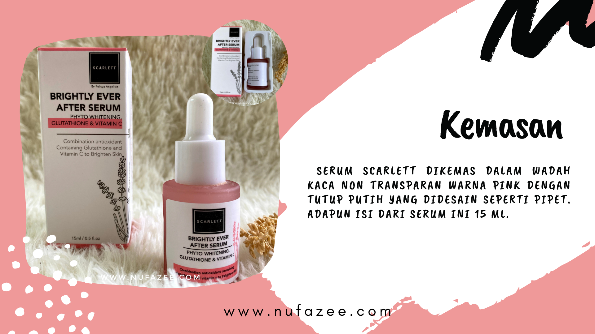 Serum Scarlett dikemas dalam wadah kaca non transparan warna pink dengan tutup putih yang didesain seperti pipet. Adapun isi dari serum ini 15 ml.